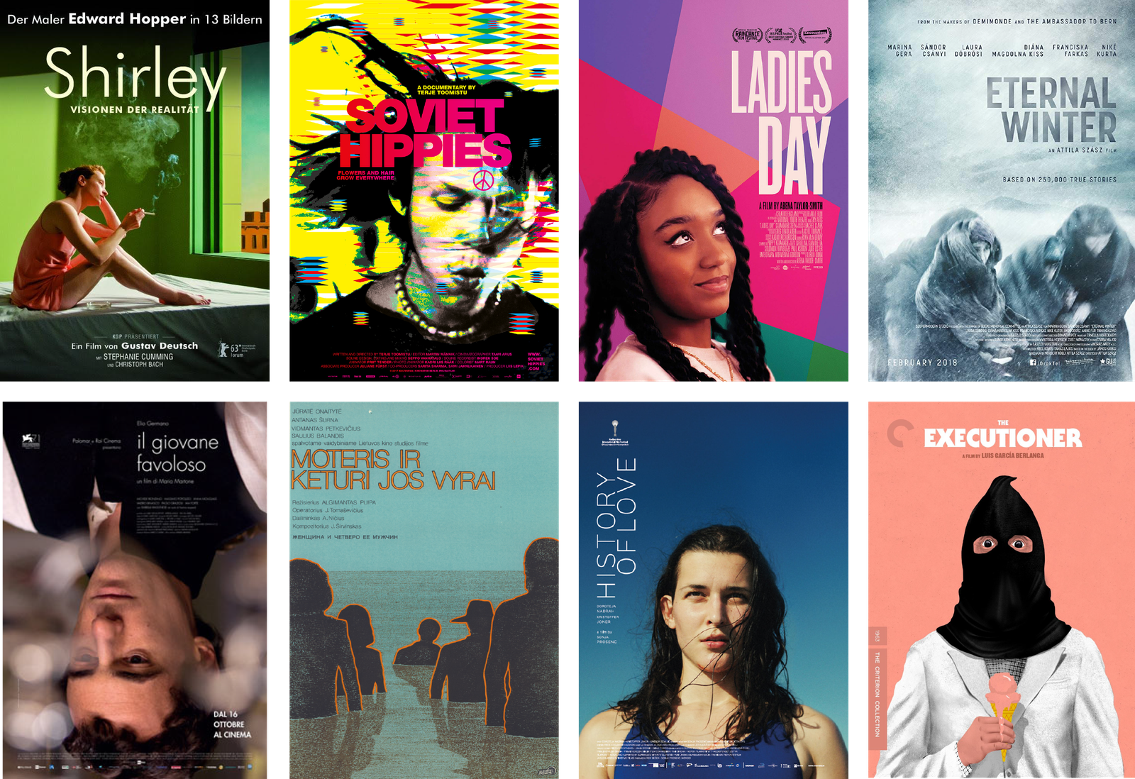 HISTORY OF LOVE (2018, Slovenie) A WOMAN AND HER FOUR MEN (1983, Litouwen) LEOPARDI / IL GIOVANE FAVOLOSO (2014, Italie) SHIRLEY – VISIONS OF REALITY (2013, Oostenrijk) ETERNAL WINTER (2018, Hongarije) THE EXECUTIONER (1963, Spanje) SOVIET HIPPIES (2017, Estland) LADIES DAY (2018 VK )